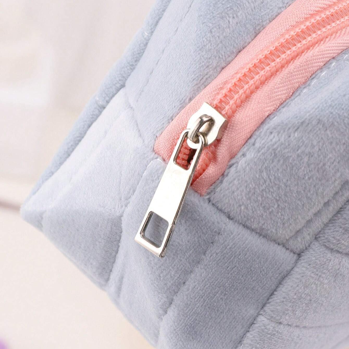 Bolsa de maquillaje multifuncional de terciopelo con corazones en color lila.