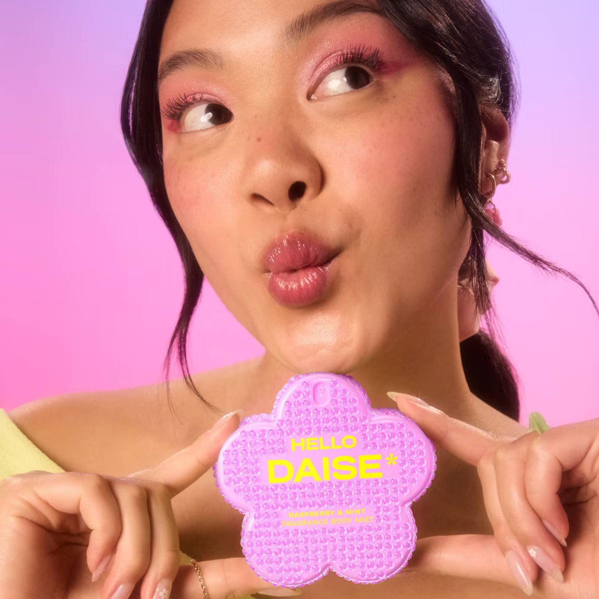 En su interior encontrarás un Body Mist HELLO DAISE de tamaño completo en Frambuesa y Menta: un aroma fresco y afrutado con notas de frambuesa ácida, grosella negra, coco batido, menta y vainilla que dura hasta 24 horas. Es suave para todo tipo de piel, seguro para el cuerpo y el cabello, y dermatológicamente probado.