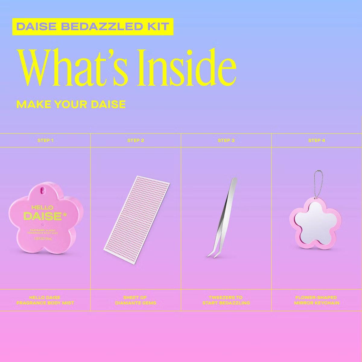 ¿Buscas un regalo original y divertido? El kit de DAISE Bedazzled es un conjunto que levanta el ánimo, combina fragancias y añade un toque de brillo, perfecto para adolescentes, preadolescentes y cualquiera que disfrute personalizando sus productos.