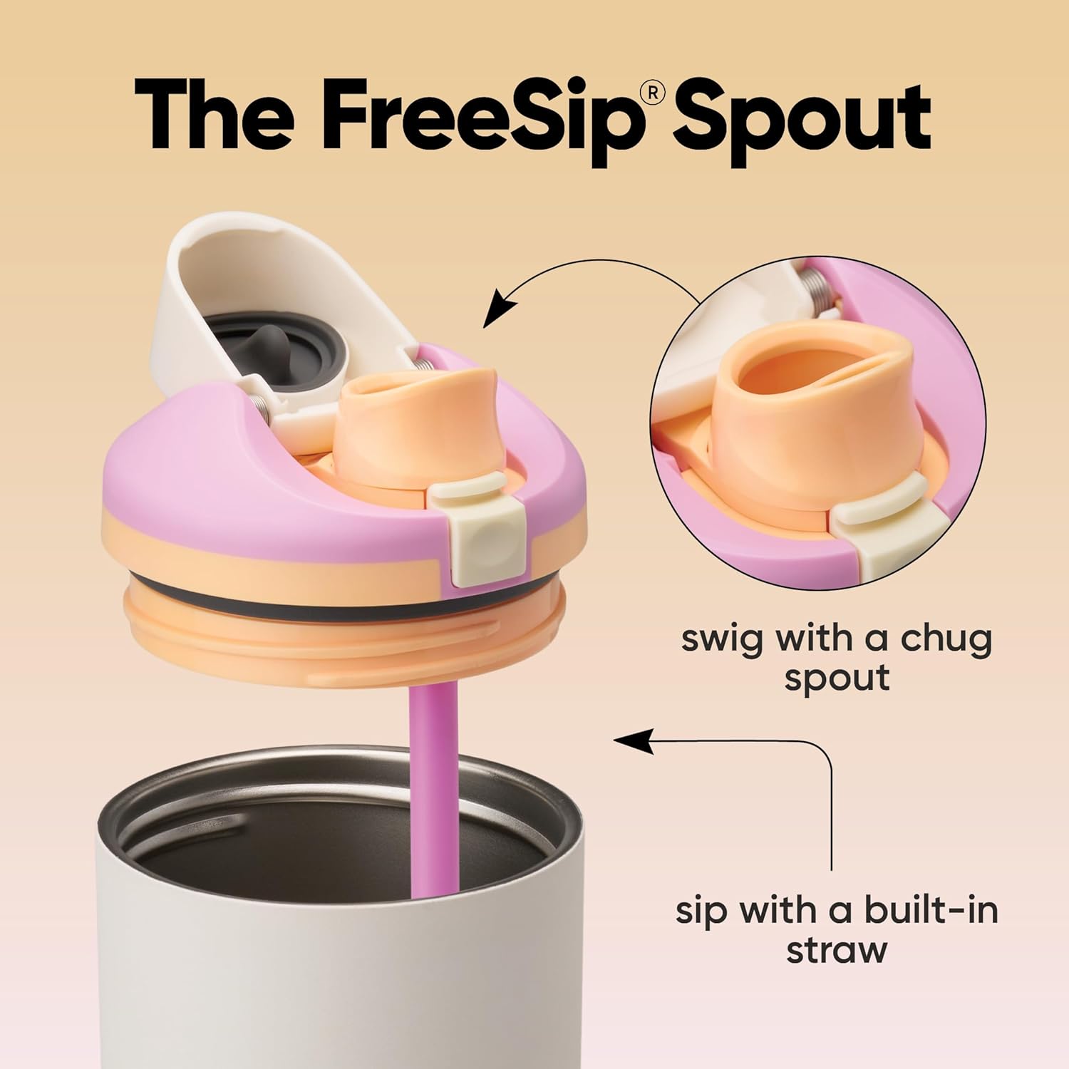 Con mi cómoda asa lateral, soy fácil de agarrar e imposible de soltar. Me deslizo perfectamente en los portavasos, así que no tendrás que hacer malabarismos incómodos en el auto. Y no olvidemos mi pico mágico 2 en 1, para beber a sorbos o a tragos. No soy solo otro vaso, soy el que estabas esperando.