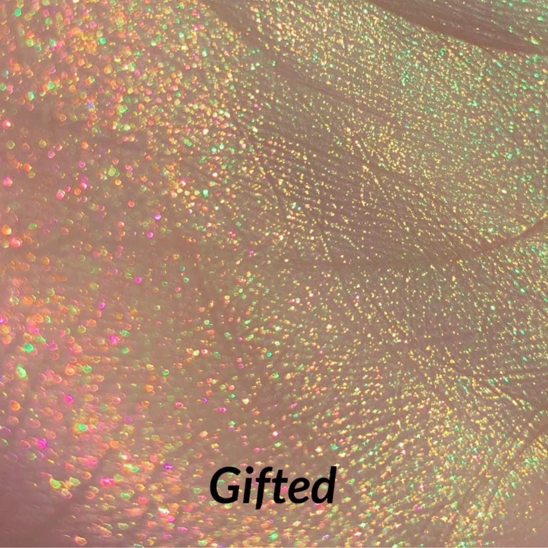 - Gifted: Un iluminador fucsia multicolor con un impresionante tono melocotón y verde azulado. Con un brillo etéreo, este esmalte cambiante iluminará tu día e iluminará el universo.