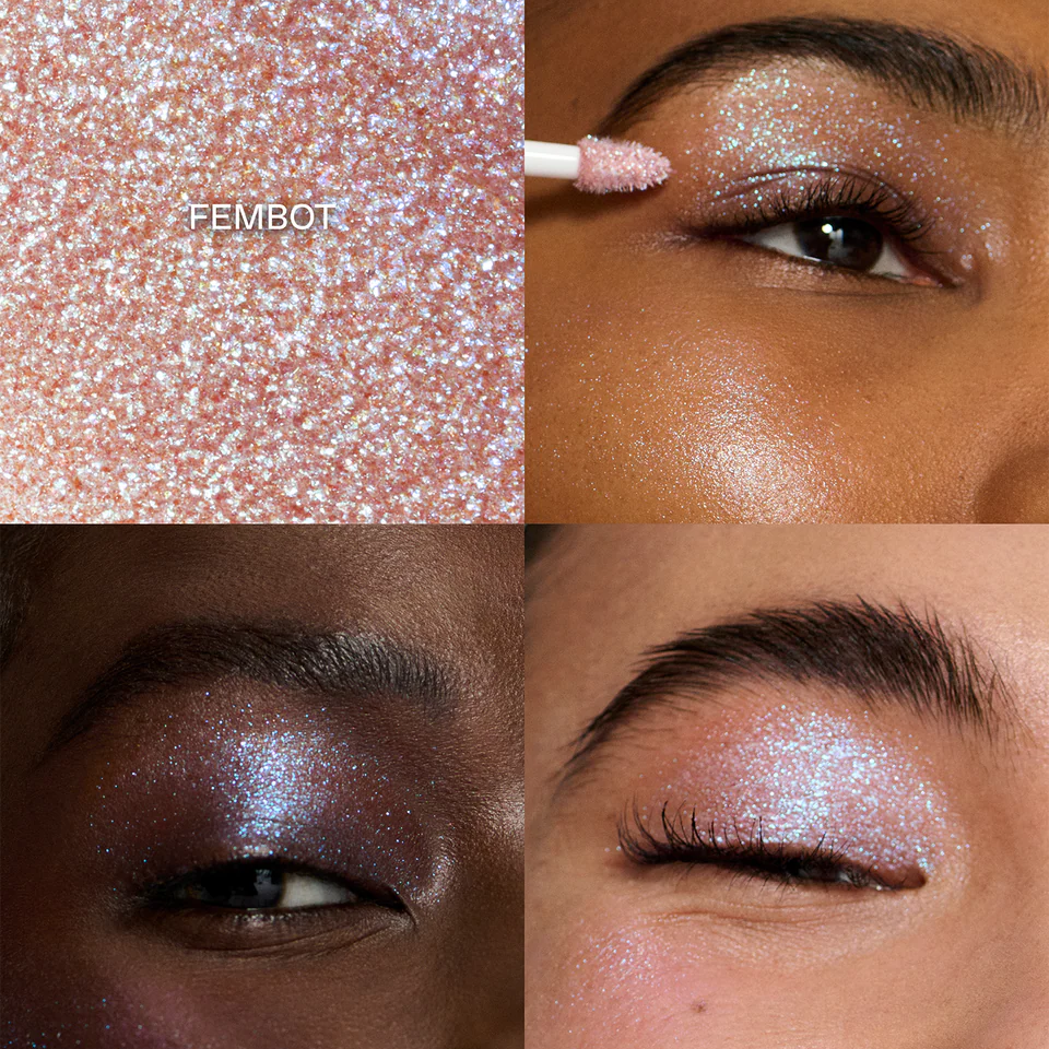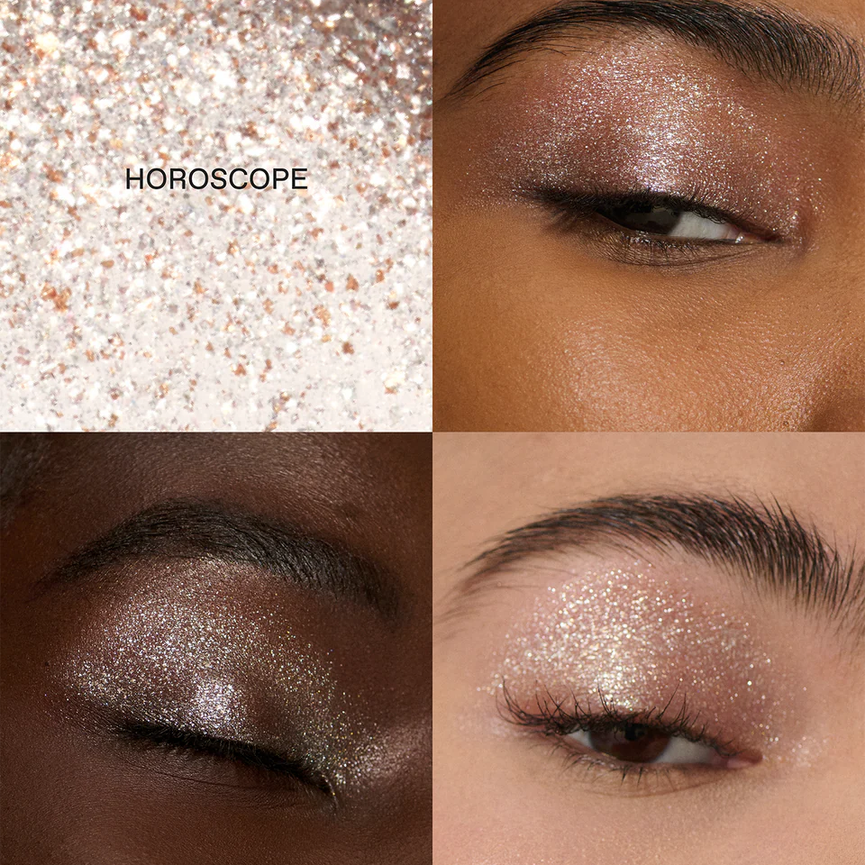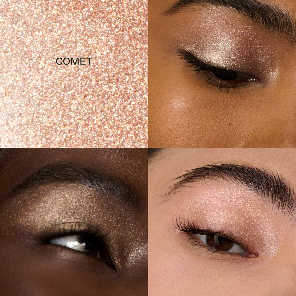 Un set de 3 sombras líquidas brillantes para crear looks desde sofisticados hasta cotidianos. Incluye Fembot (azul iridiscente), Comet (champán metálico) y Horoscope (gris topo iridiscente).