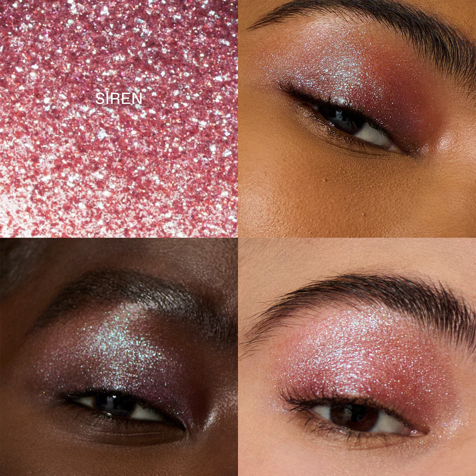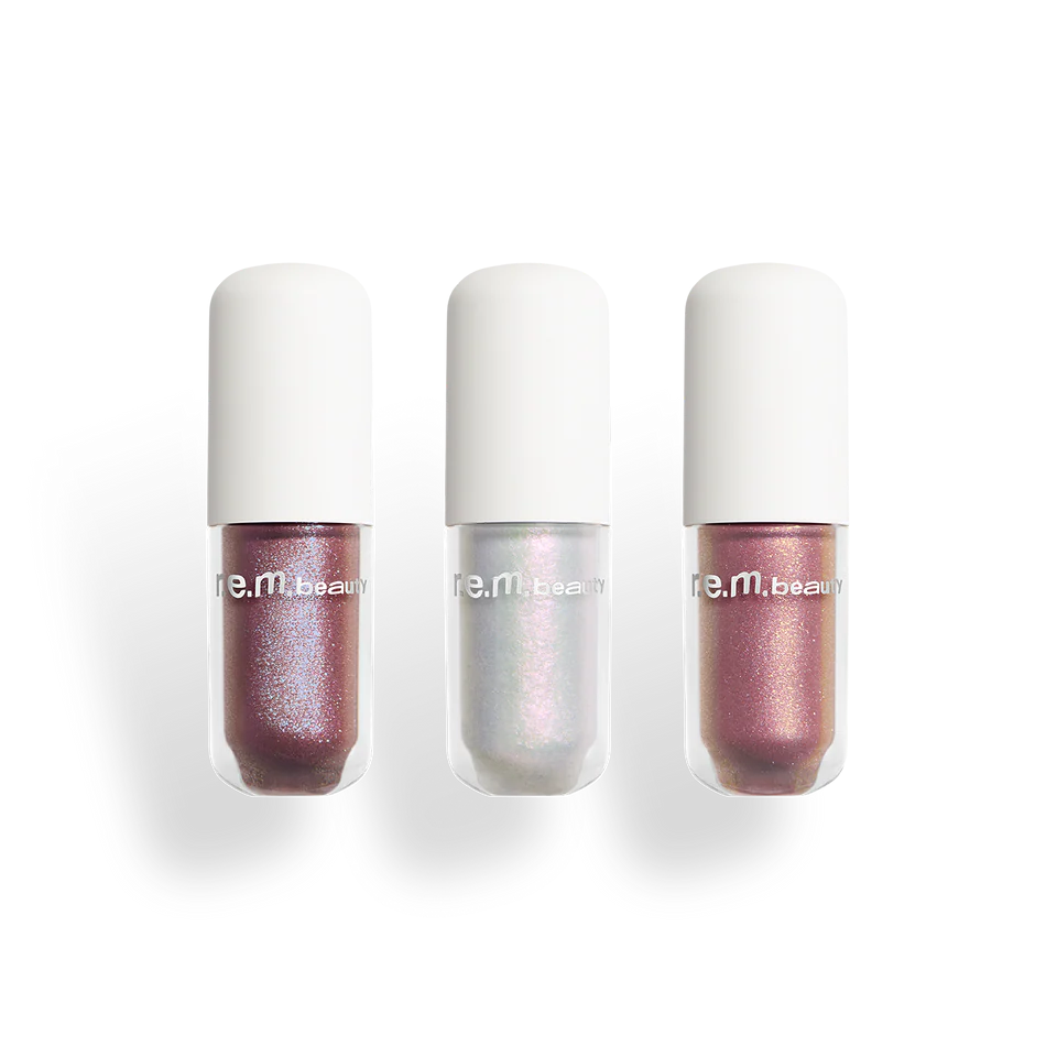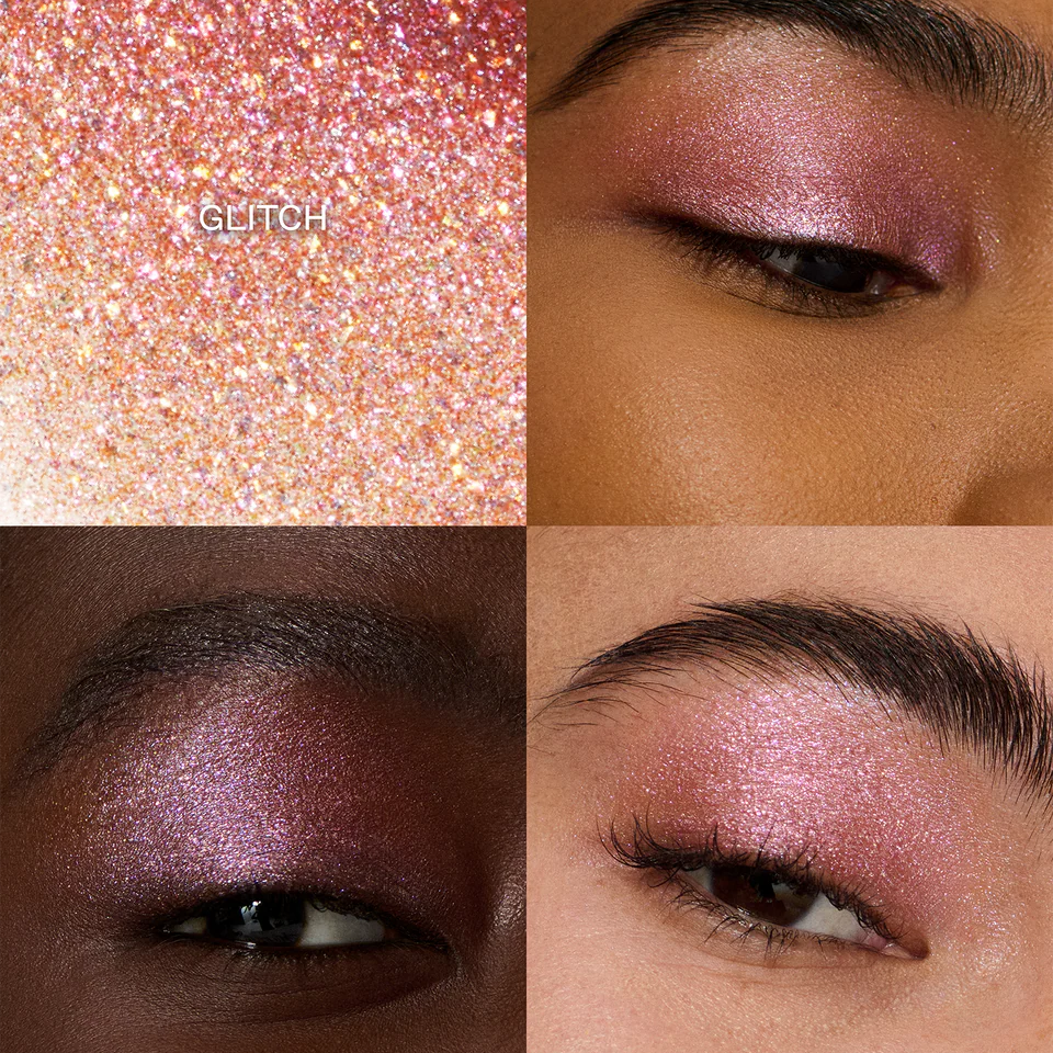 Un set de 3 sombras de ojos líquidas y brillantes en tonos rosados, con Labcoat (rosa iridiscente), Comet (champán metálico) y Glitch (rosa dorado iridiscente).